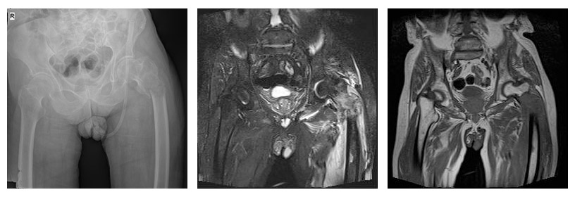 Before the surgery: X-ray and MRI show a fracture, displacement, and surrounding edema in the left hip (proximal femur) bone.