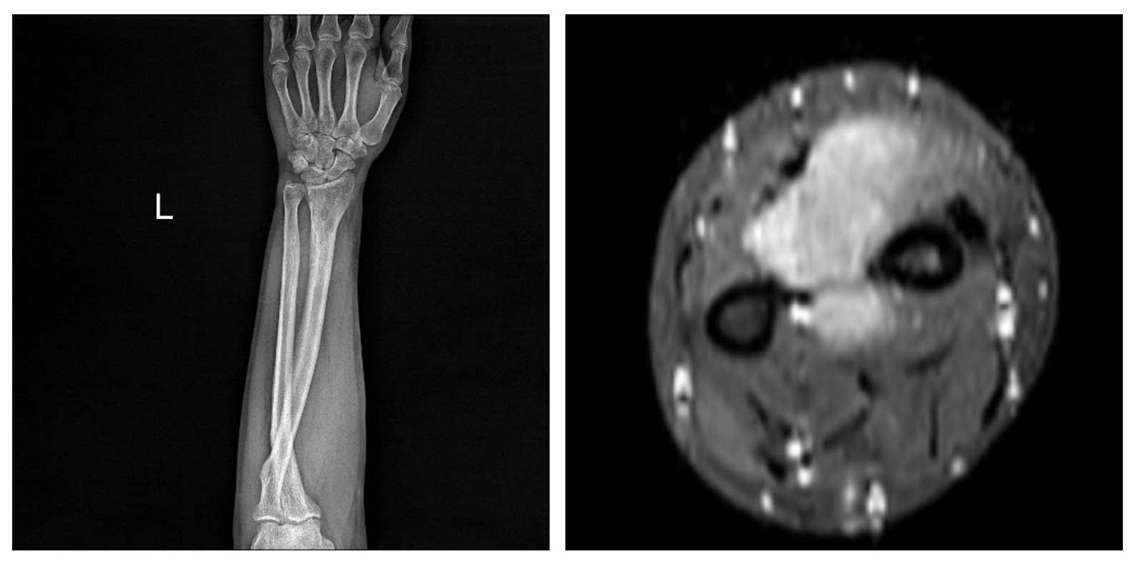 Ameliyat Öncesi: Röntgende radius distalde düzensizlik ve skleroz, MR’da çevreleyen yumuşak doku komponenti görülmekte.