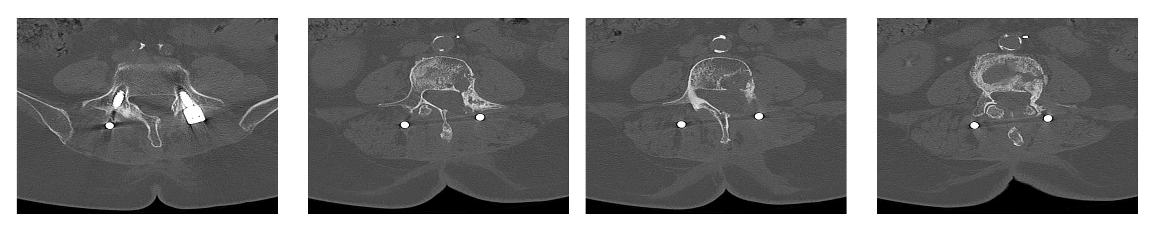 Ameliyat Öncesi: Tomografide vidalarda gevşeme ve omurgada kırığın eşlik ettiği harabiyet görülmekte.