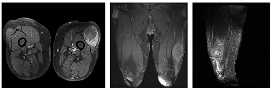 Ameliyat Öncesi: MR’da uyluk yerleşimli düzensiz sınırlı heterojen kitle görülmekte